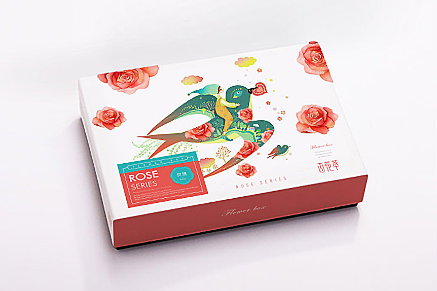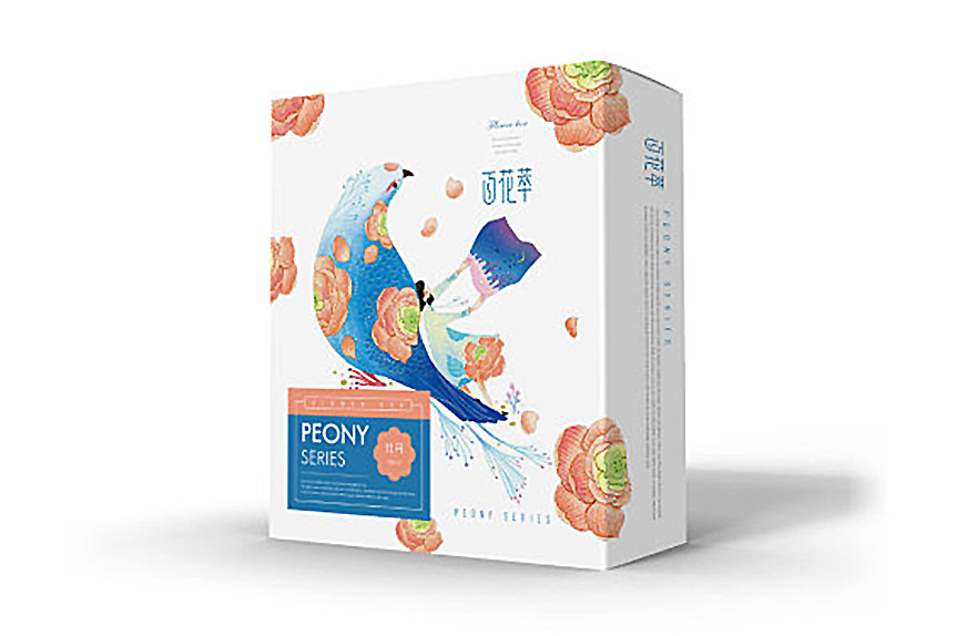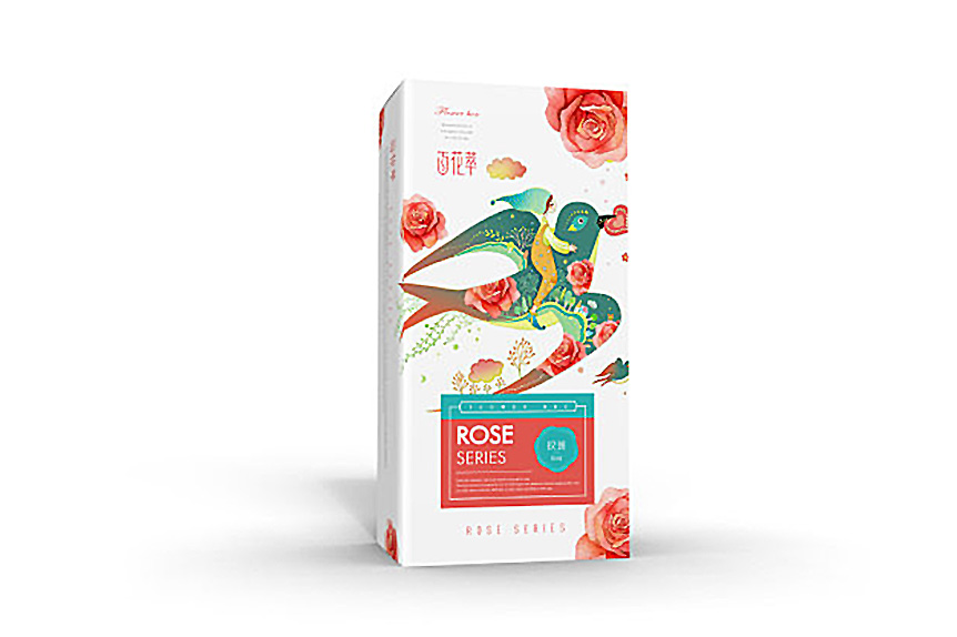 百花萃護(hù)膚品在產(chǎn)品包裝上,logo字體變形給人一種文化韻味,Penoy和Rose系列包裝的畫面是分別以牡丹和玫瑰散落在小女孩和小鳥的四周,小女孩坐在鳥上,給人一種與自然融為一體的感覺。而牡丹和玫瑰的花瓣使Penoy和Rose系列產(chǎn)品得以區(qū)分,這一包裝設(shè)計使得百花翠系列產(chǎn)品神似而形不似在視覺上給人整體性。